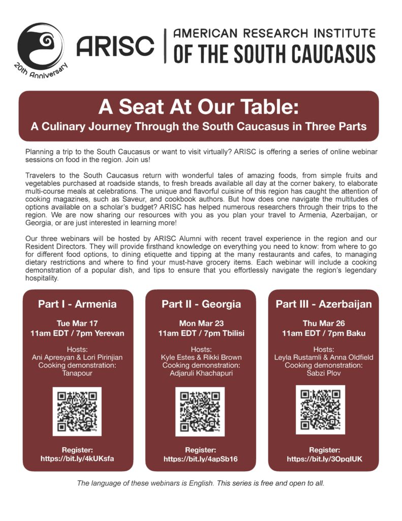 Planning a trip to the South Caucasus or want to visit virtually? ARISC is offering a series of sessions on food in the region. Join us!